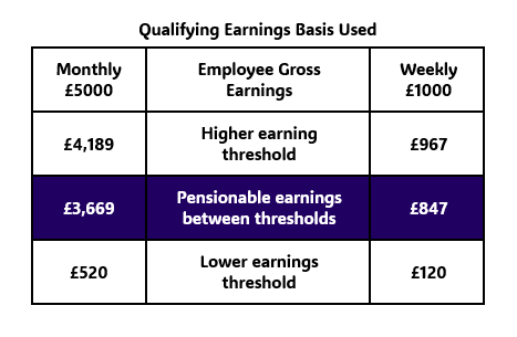 In the above example, if an employee is paid £1000 a week, the lower earnings threshold of £120 is deducted and any earnings above £967 are ignored. This means the employees pensionable earnings are £847 and is what the pension contributions are based on.