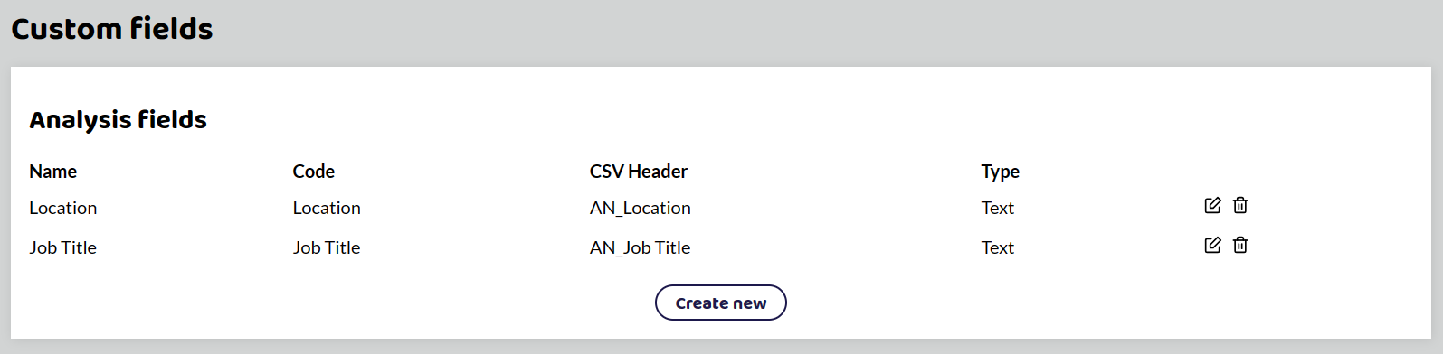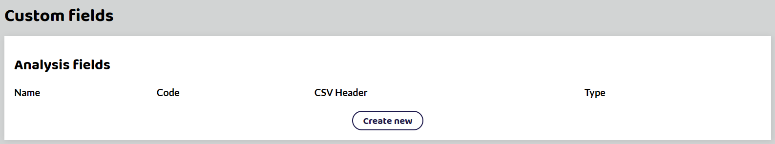 This will take you to your custom fields page which, if you haven't set any analysis fields up before, will be empty. To create an analysis field, click the Create new button.
