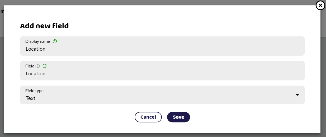 Once you've clicked Create new the following page will appear, type in what you would like the name of the field to be within Shape under Display name and then type in what you would like the Field ID to be. This is used when importing using CSV or via the API into these fields. To keep it simple it is recommended you use the same description for both. In this example, I have typed "Location" in Display name and Field ID, leaving the field type as "Text".
