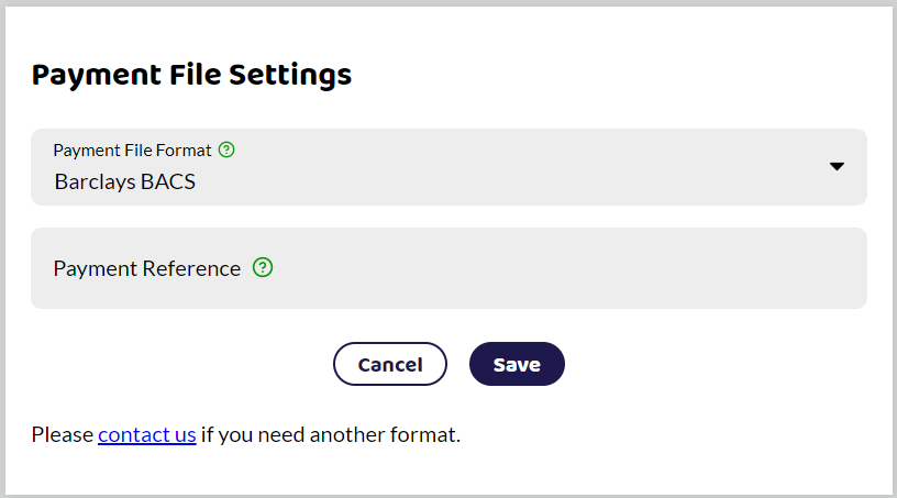 Some banks accept payment files that can be uploaded for BACS payments. This is normally only for large companies that have this facility set up. Please see Payment File Settings for more information on the different formats available.
