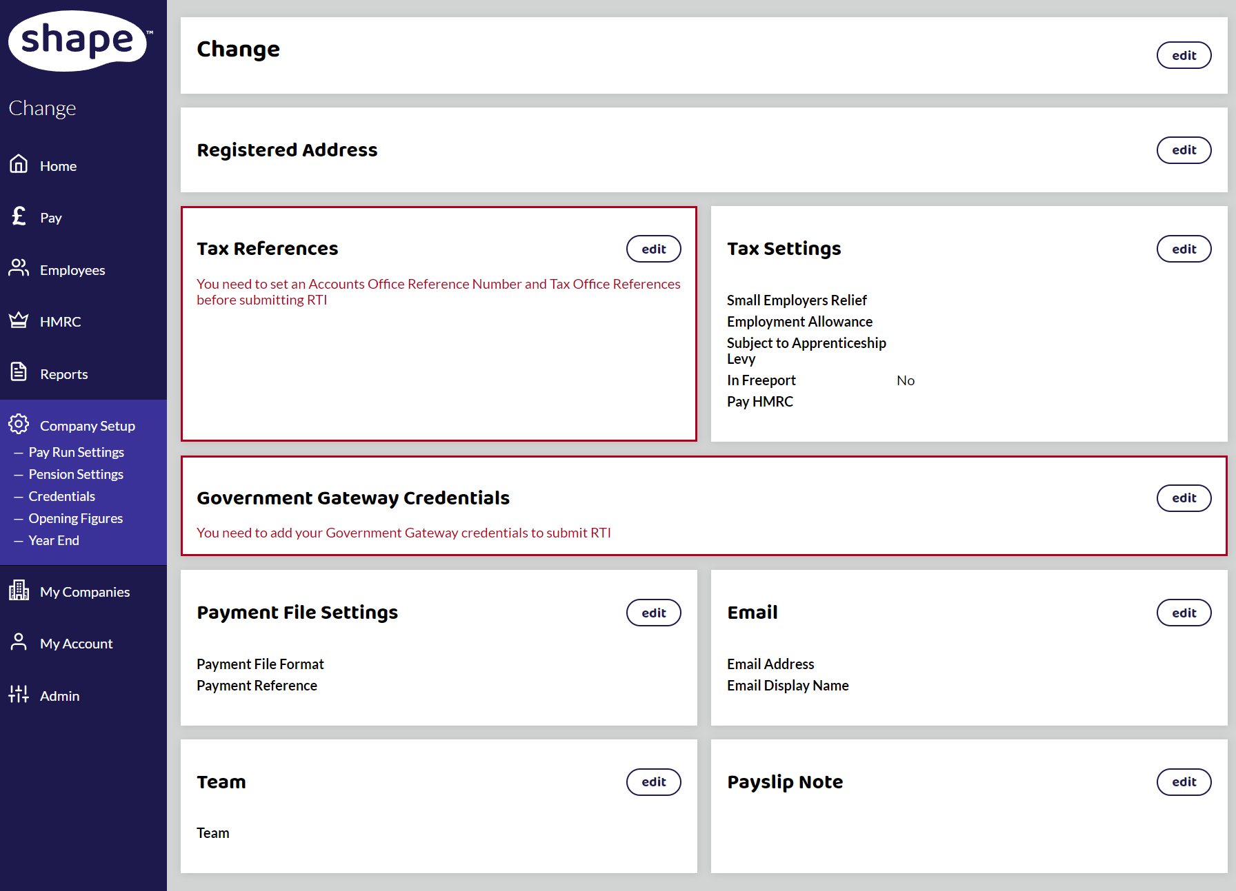 Select Company Setup in the side menu. When you first look at the Company Setup page, if there are areas highlighted in red, this information is needed before you can submit information to HMRC.