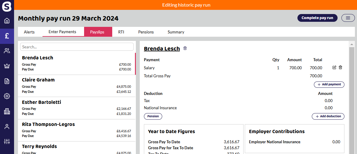 Once open the pay run will show that you are editing a historic pay run. Select Enter Payments and the employee you want to edit.
