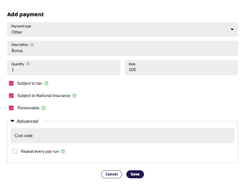 Add the payment or deduction. As with adding payments normally, you can choose different payment types and depending on the type choose whether they are subject to tax, NI, pensionable or a regular payment. You may wish to untick the Repeat every pay run box if it's a one-off payment.