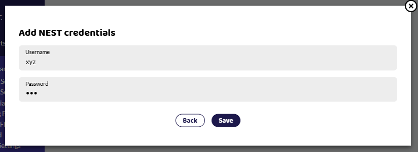 If you haven't already added your NEST credentials here during a pay run to connect to the NEST API, then you can +Add Credentials here.