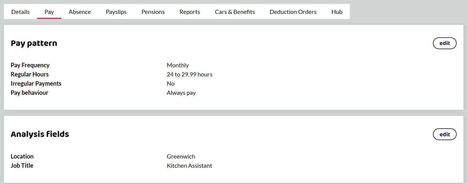 Once Custom Fields are set up, they appear in different places within Shape. The first is within the employee profile, navigate to any of your employee's profiles, go to the second tab Pay and you will see the Custom fields (or "Analysis fields") have now appeared. Click edit to enter the appropriate entries under each.