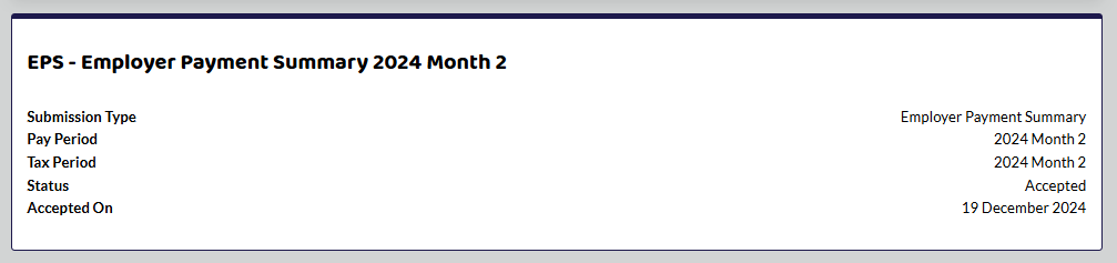 If your EPS has been received by HMRC you will see Accepted in the status field along with a sent and accepted by HMRC time and date.