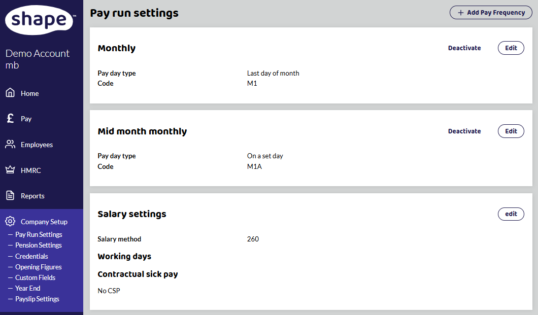 To set this up, go to Company Setup - Pay Run Settings. Select +Add Pay Frequency in the top right hand corner.