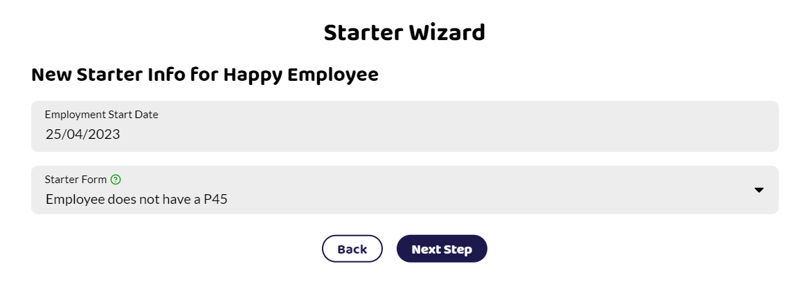 Select that the employee does not have a P45. This is because you are using the starter checklist.