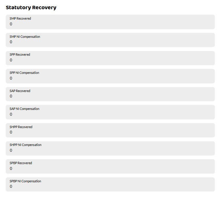Make sure you put the correct statutory payment in as shown above. If you are entitled to Small Employers Relief, this is put into the NI Compensation box. Leave any fields not relevant to you as 0. The list below shows the different statutory payments that can be reclaimed:
