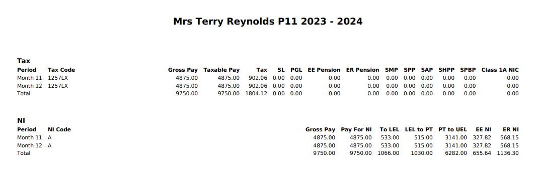 For each employee, you can download a P11 report that shows their gross pay, tax and NI paid with a breakdown for each week or month in one file.
