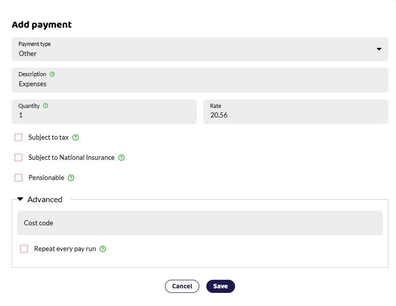 All named payment types are subject to Tax, NICs and Pensionable. If you need to make another type of payment, e.g. an expense reimbursement or a mileage claim then select the Other payment type. You can then select if the payment will be taxed, NICed or included in pension calculations. Please refer to HMRC guidelines below for the type of payment you are making.