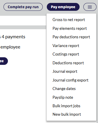 To import payments go to the current open pay run. Click the button in top right corner and select New bulk import.