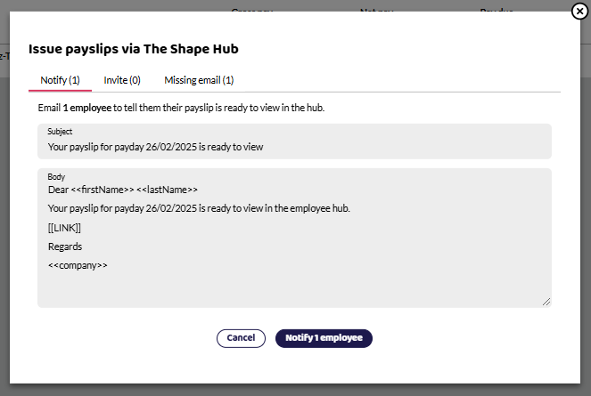 Yes, you can edit the payslip notification email subject and body before sending to employees. The default text is different when you Email payslips to employees or Issue payslips via The Shape Hub. The test is editable before you click Send or Notify.
