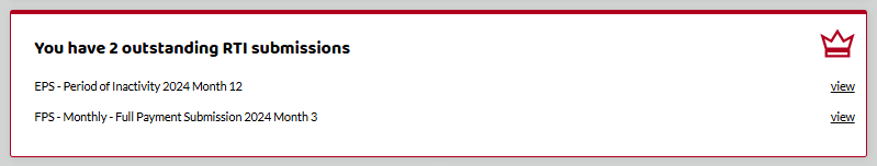 All submissions can be found in the side menu under HMRC -> RTI Submissions. You can also link to this page from RTI Submissions on your homepage and any outstanding submissions will show as below.