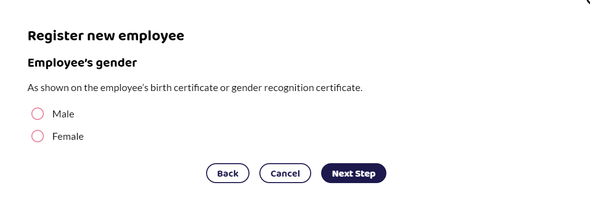 Male or Female as shown on the employee's birth certificate or gender recognition certificate. It is required for FPS submissions. Applying the wrong gender can affect national insurance contributions and statutory payments if incorrectly selected.