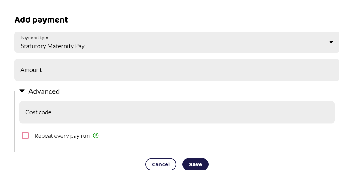 When you add a payment to an employee, you will see in the drop down menu that each statutory payment has its own name. Select which payment you need and enter the amount you are paying. You must use these pay elements if you wish to reclaim from HMRC through the system.